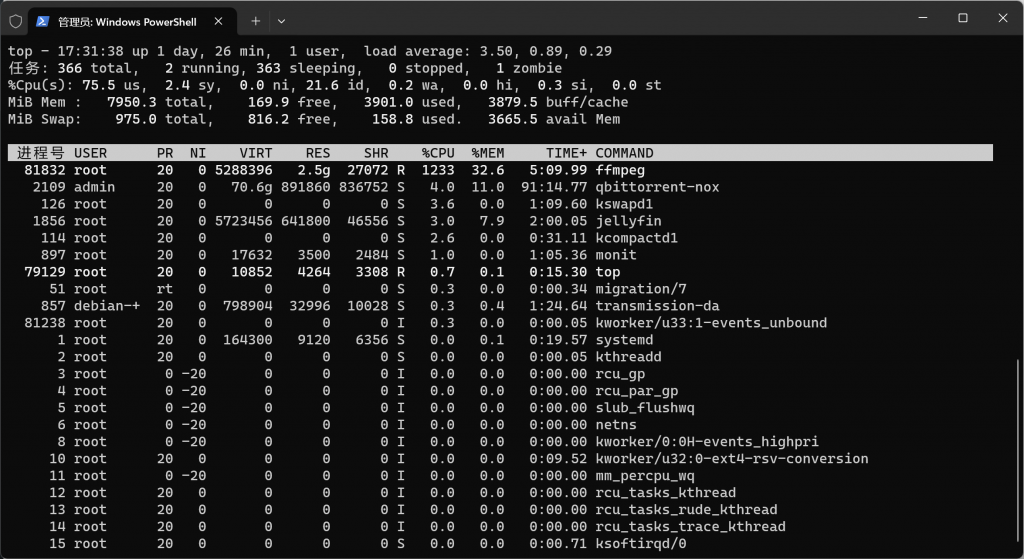 下方的%CPU表示单个应用程序在一段时间内的占用cpu单个线程的百分比,这个值可以超过100,因为现代CPU基本上不可能只有一颗核心,下图是在一个有16核心16线程的虚拟机系统内软解4k高码率视频的占用率,可以看到超过了1200%,这个值更多的是用来看单个进程是否占用过高资源,并不能反映整个系统的资源占用。