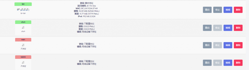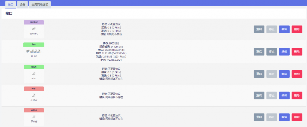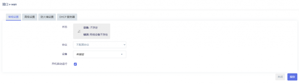编辑wan和wan6,将协议修改为“不配置协议”,将设备修改为“为指定”