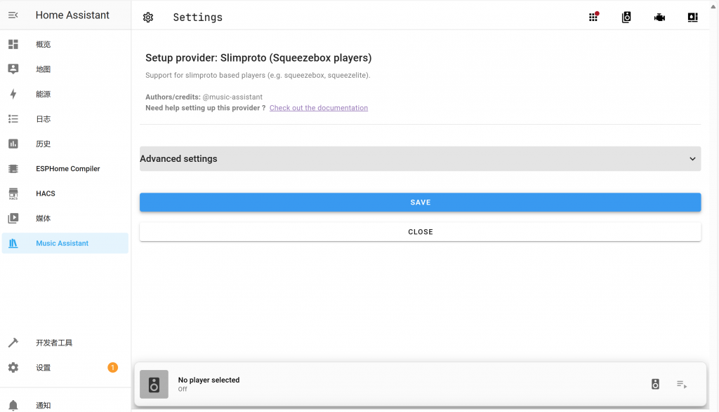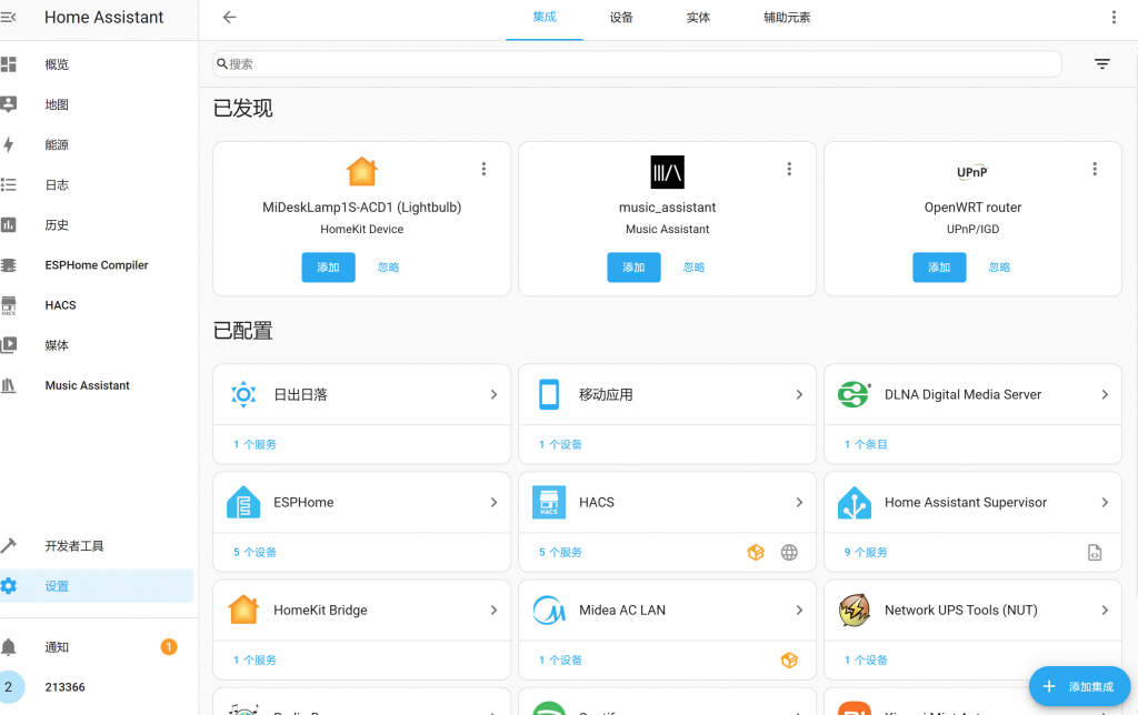 回到homeassistant的设置——设备与服务,会发现自动发现了music assitant,正常添加即可,需要注意,这个自动发现的部分是2024.12更新提供的,再往前的版本需要自行前往HACS下载对应插件才可发现(这个部分在music assistant的教程内有详细描述)。