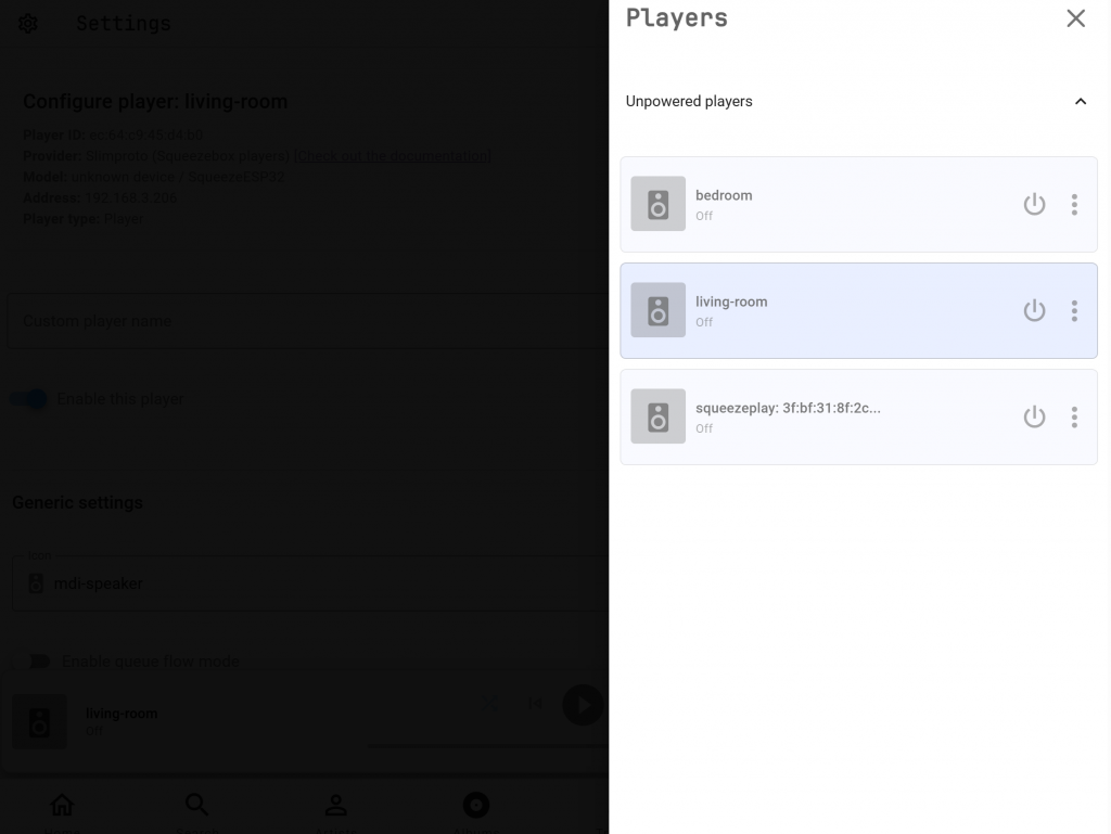 回到设置,配置Squeezebox players,安装完成这个之后才能发现安装squeezelite-esp32的机器。发现是全自动的,无需干预。