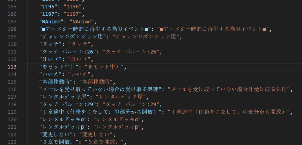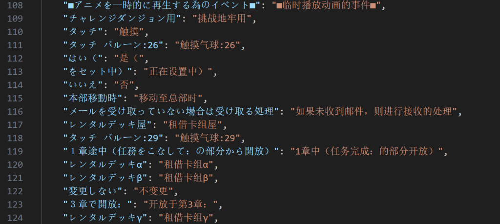 在这个界面点击导出待翻译的原文后,游戏目录下会出现一个名为ManualTransFile.json的文件,这便是游戏内的几乎所有文本,其格式大致如此,冒号前面的是游戏原文,冒号后面的是未来需要替换成中文的