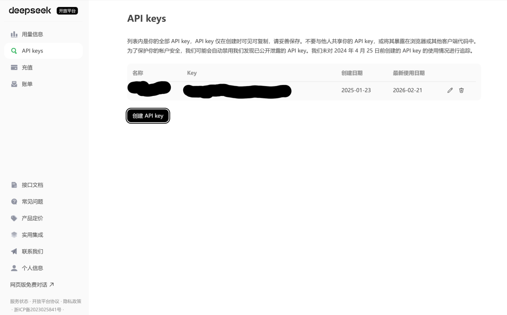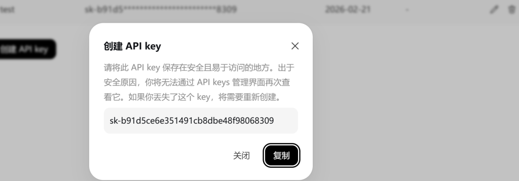 复制并存好你的API key(该KEY仅作展示,教程发表时已经删除)