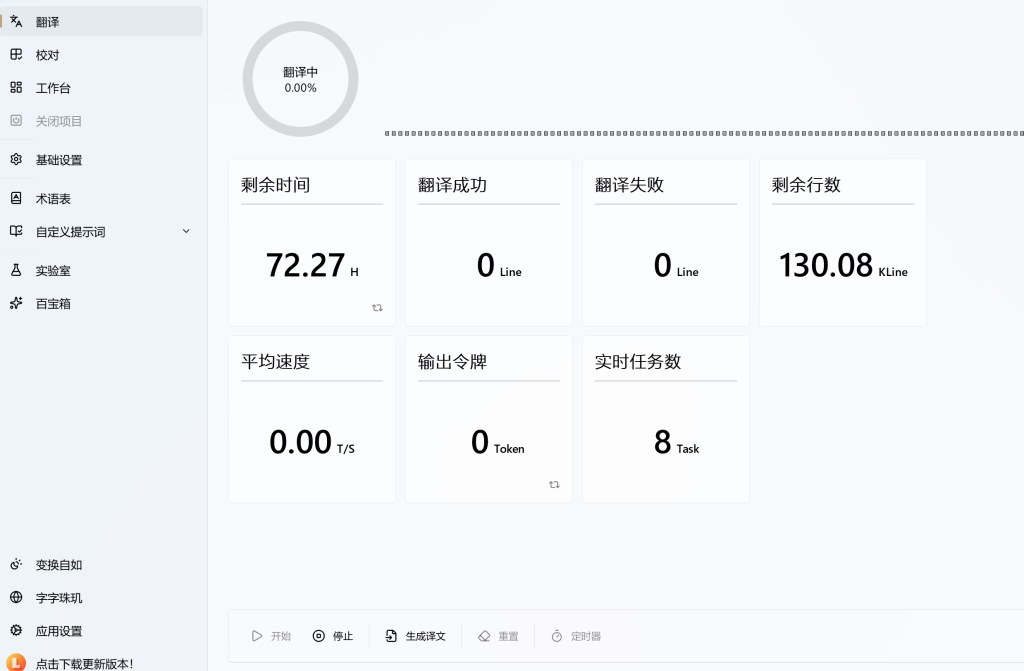 在这之后,最基础的配置便已经完成,如果没有任何进一步的需求,那么便可以开始翻译,点击左侧翻译——点击开始即可开始,等待翻译结束,如果想提前检查翻译质量点击生成译文即可在不中断翻译的情况下提前导出json文件。