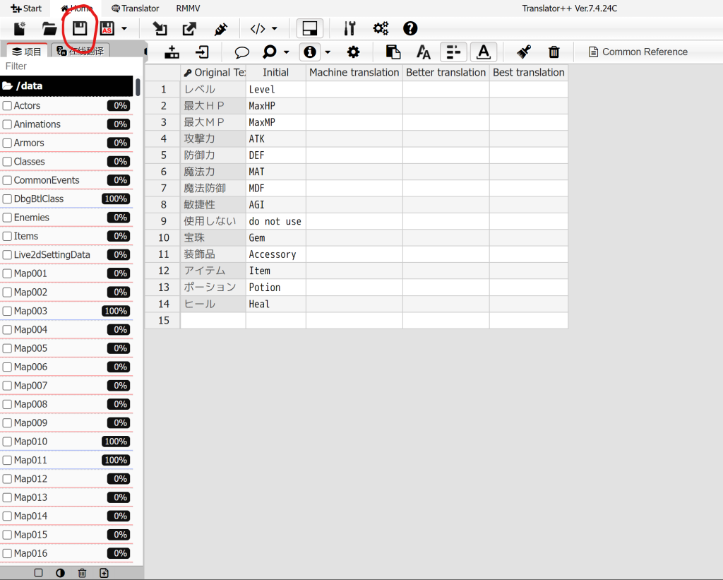 点击右上角的保存按钮,会生成一个trans文件,到这里就完成了上面的第一步mtool及文本导出的步骤,之后的步骤基本上一样,我们直接来到导回游戏的步骤