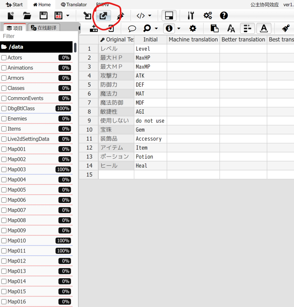 换句话说,如果我们这时候再次导出文本,那么这一次导出的文件就是半汉化的,而之前mtool难以处理的,那些带占位符的文本已经被处理好了。所以我们可以再一次的打开mtool,用mtool导出待翻译的文件,在翻译后再次导入回去即可。