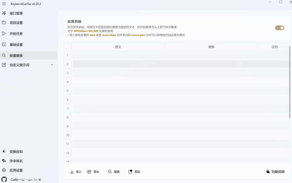 这一次的汉化我们需要使用NEKOparapa/AiNiee,ainiee自带语言识别,在开始任务前会识别待翻译的文件,将我们已经完成汉化的部分从任务序列中摘出去,完成剩余部分的查漏补缺。ainiee的UI和linguagache基本一致,就不赘述,请参照上方linguagacha的教程。